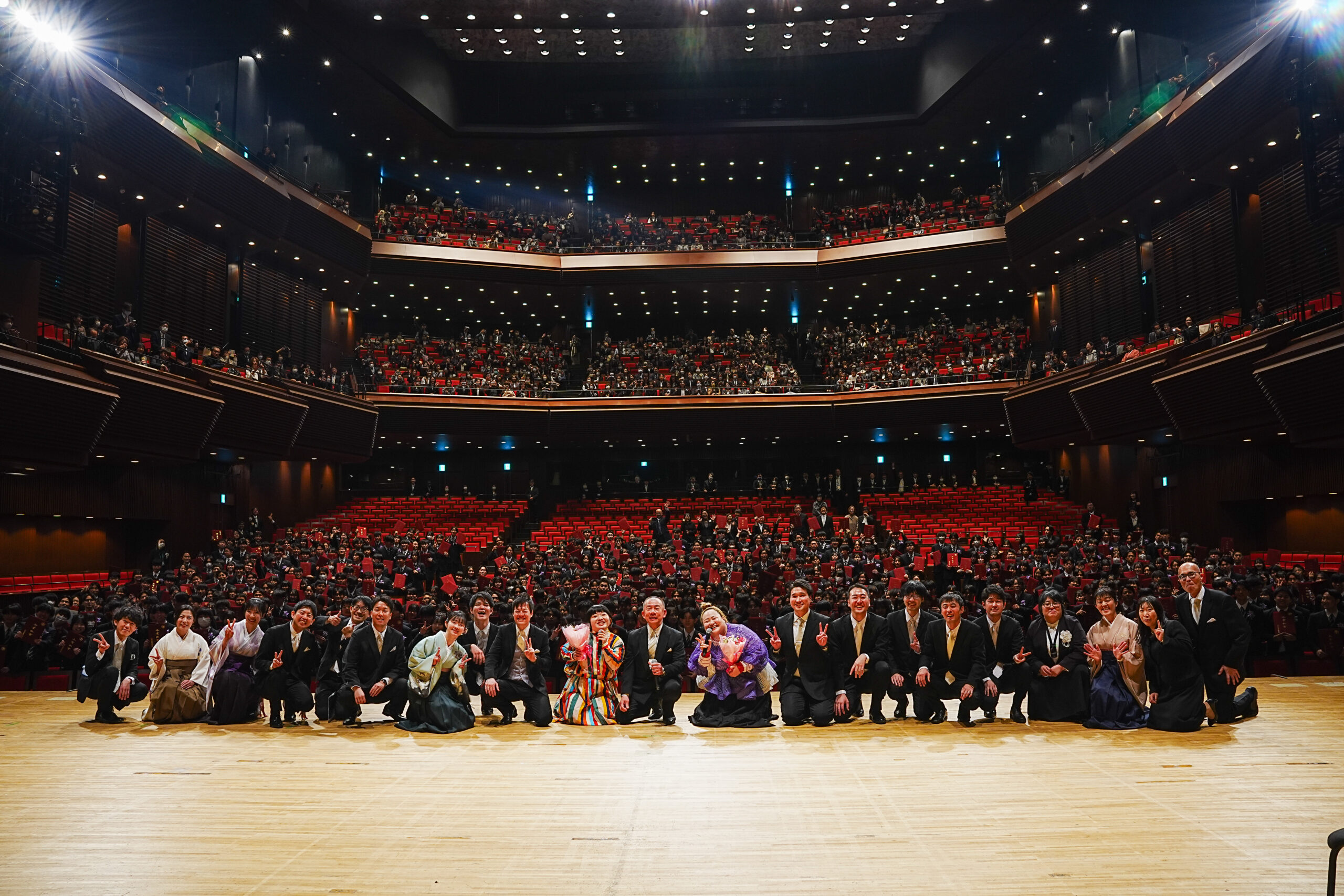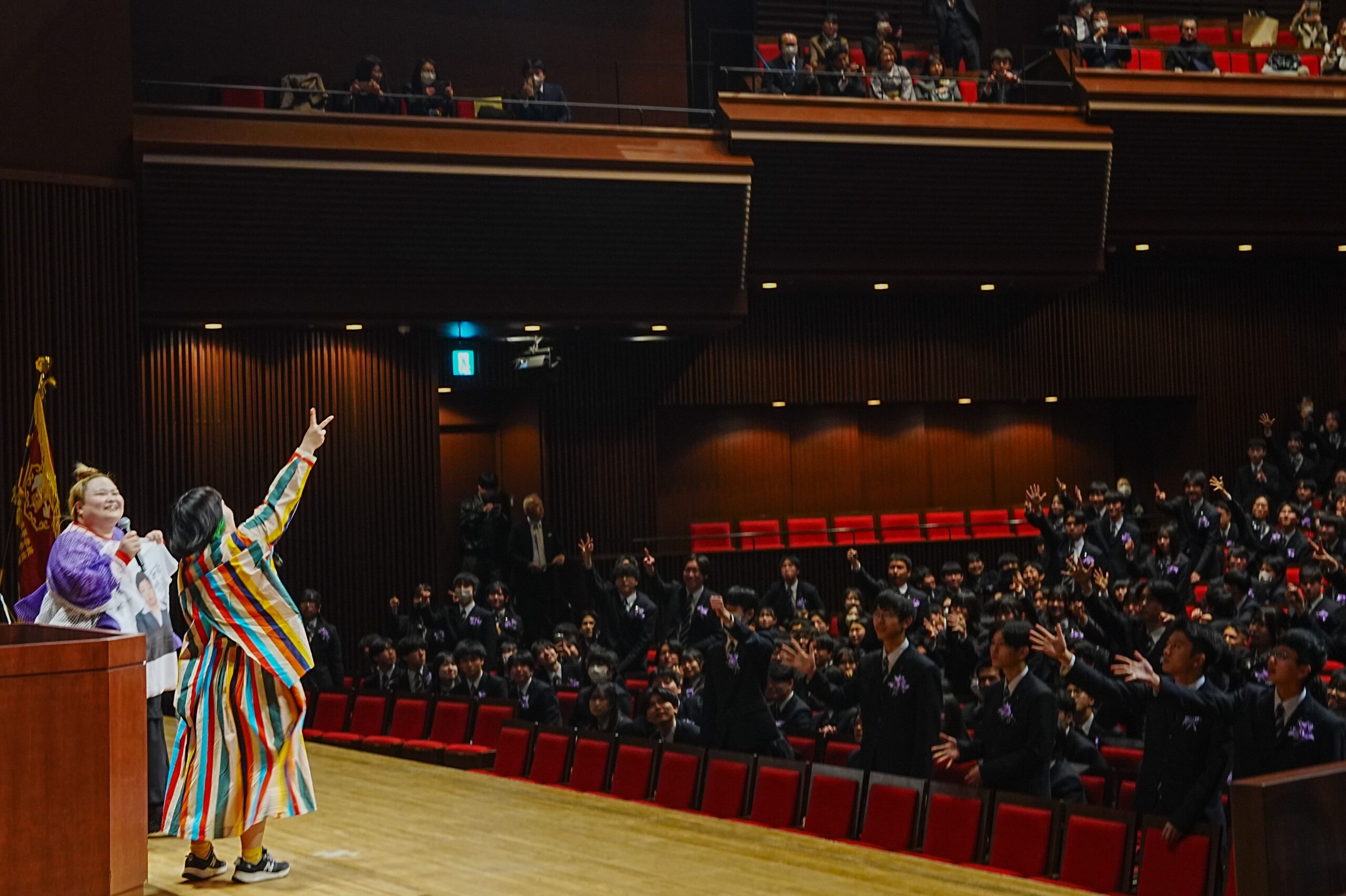 卒業式の厳かな雰囲気が残る会場でしたが、お二人の登場とともに会場は一気に明るい空気に包まれ、大きな歓声と拍手が湧き起こりました。