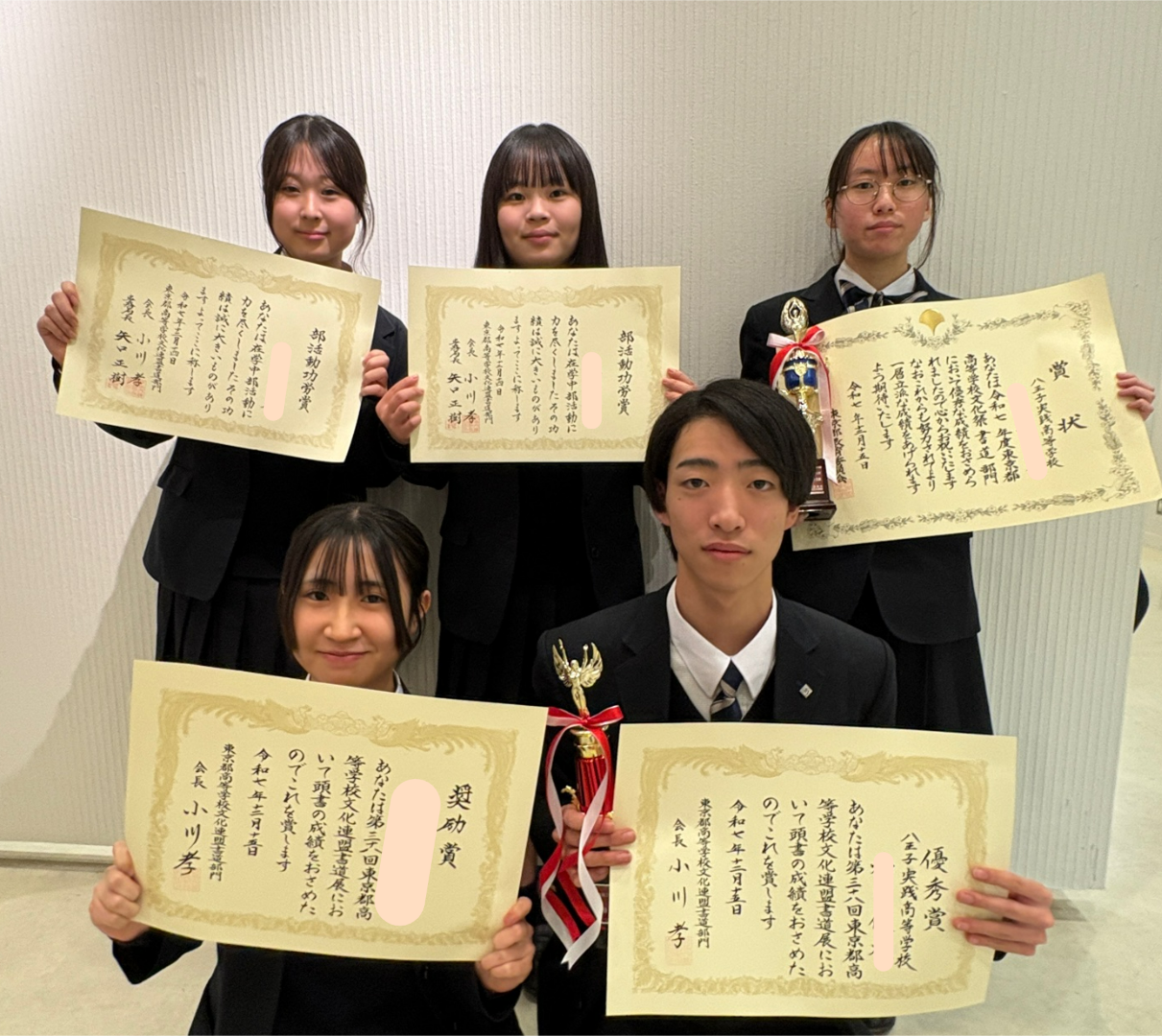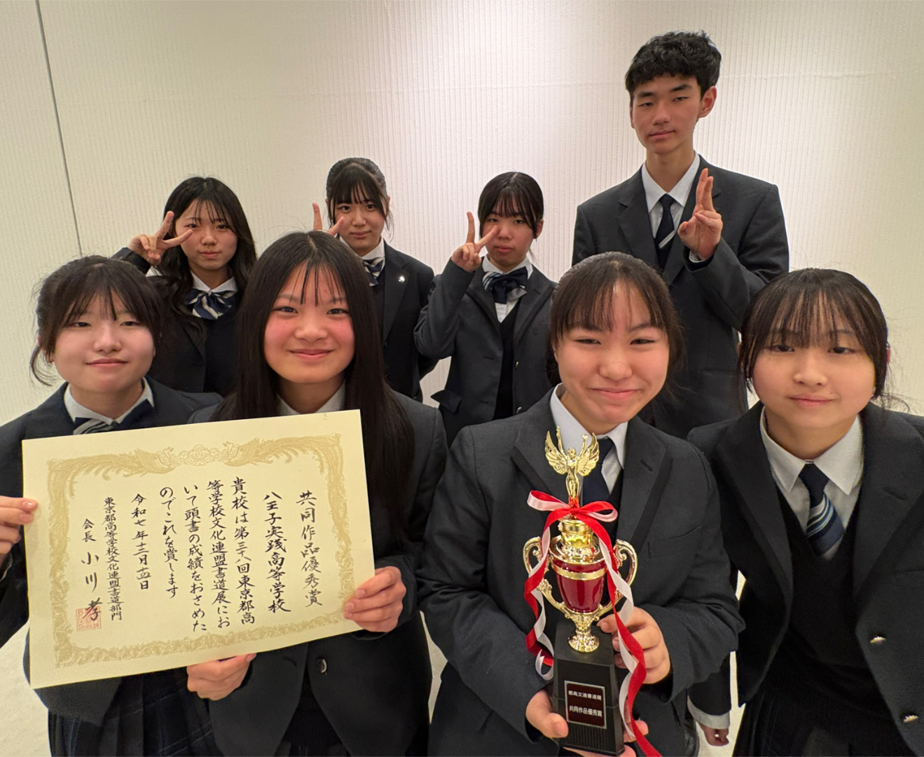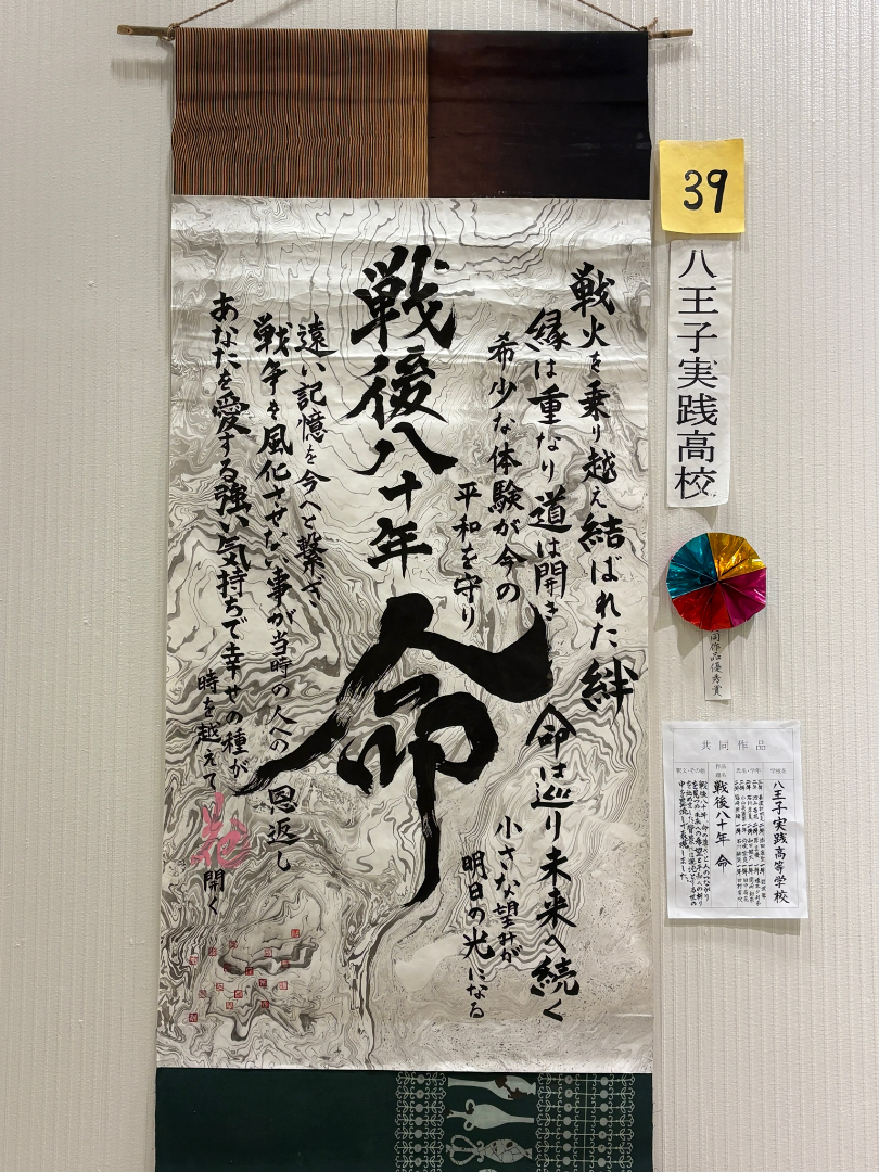 共同作品は、書く紙を部員たちで作成し(墨流し)、文章や構成、表装も自分たちで考え、想いを込めて作成したところ、2年連続の優秀賞となりました。本当に嬉しかったです。来年も3年連続の1番を目指します。